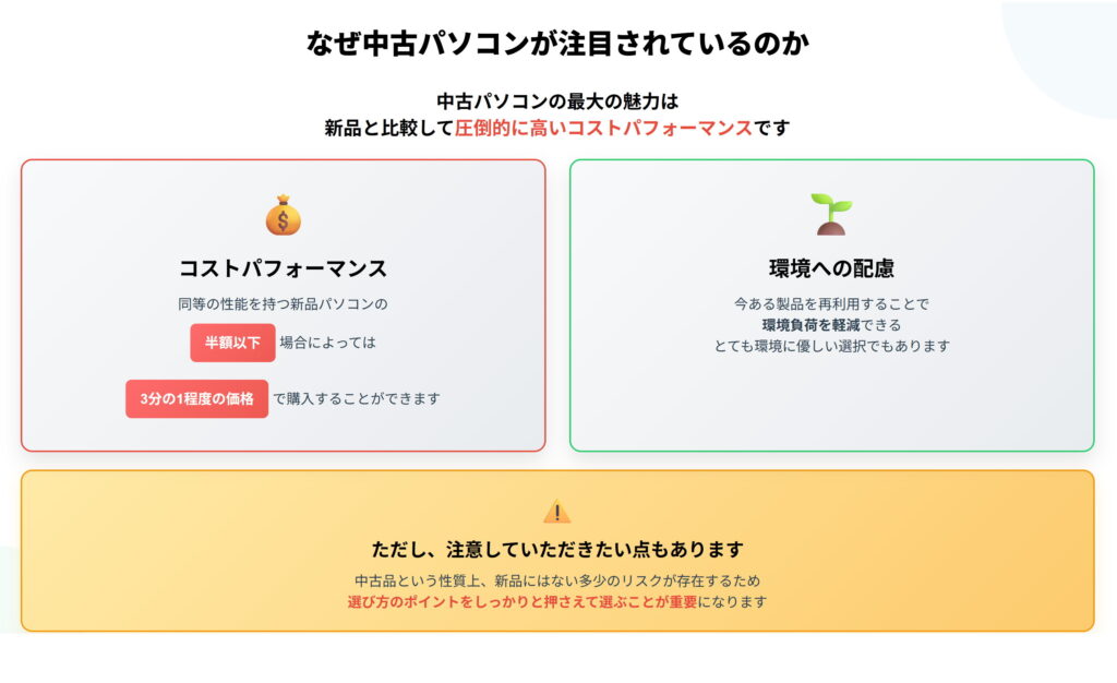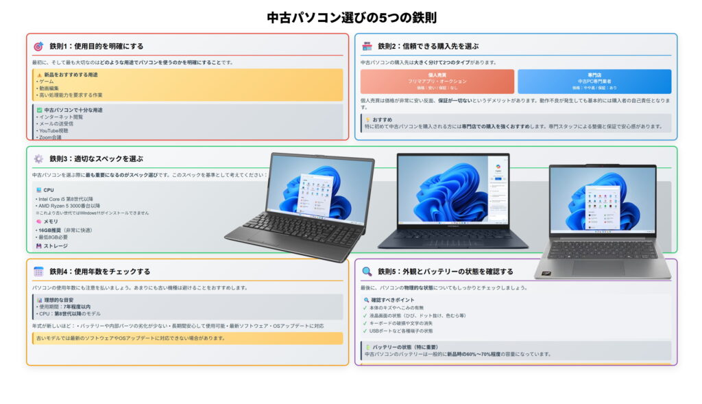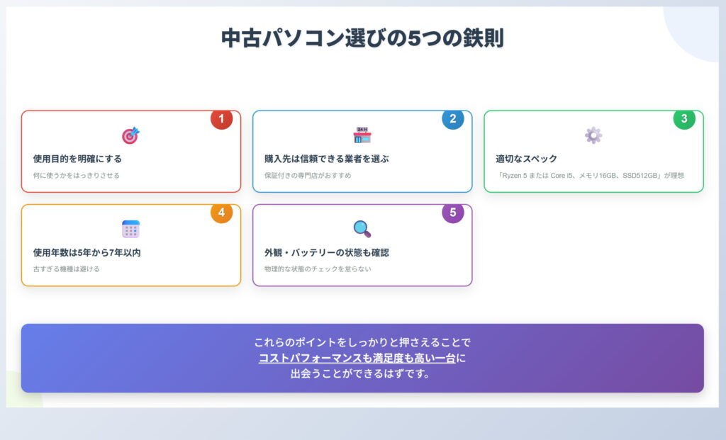 今回は、実際の事例も交えながら、中古パソコン選びで失敗しないためのポイントを5つに絞ってご紹介します。