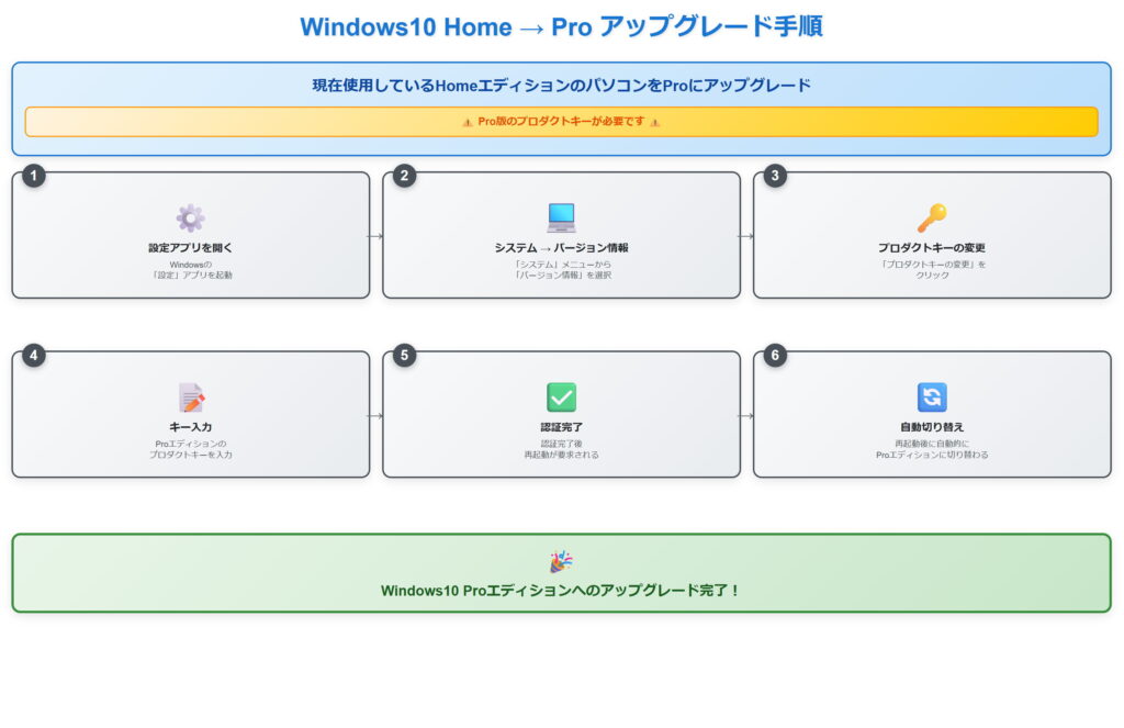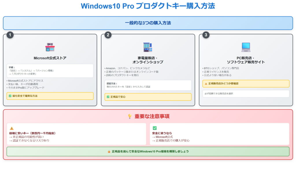 HomeエディションをProにするには、Pro版のプロダクトキーが必要です。購入方法は以下の3つ。