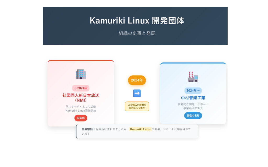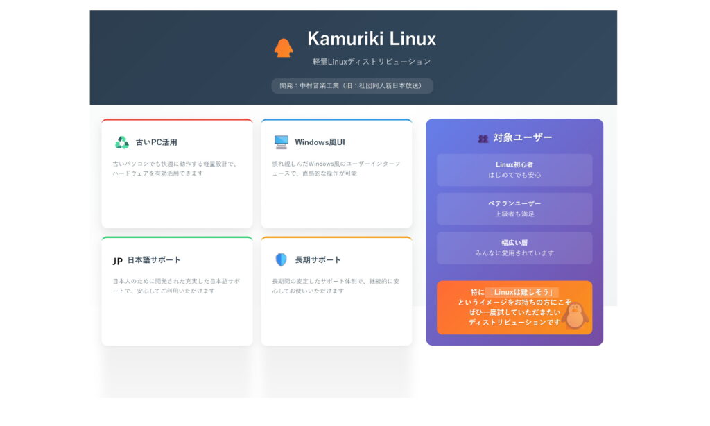 Kamuriki Linuxは、日本の開発団体「中村音楽工業」によって開発されているLinuxディストリビューションです。