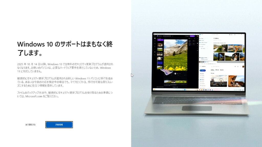 最近では、Windows10を立ち上げるとMicrosoftから「サポート終了のお知らせ」が画面いっぱいに表示されるようになりました。