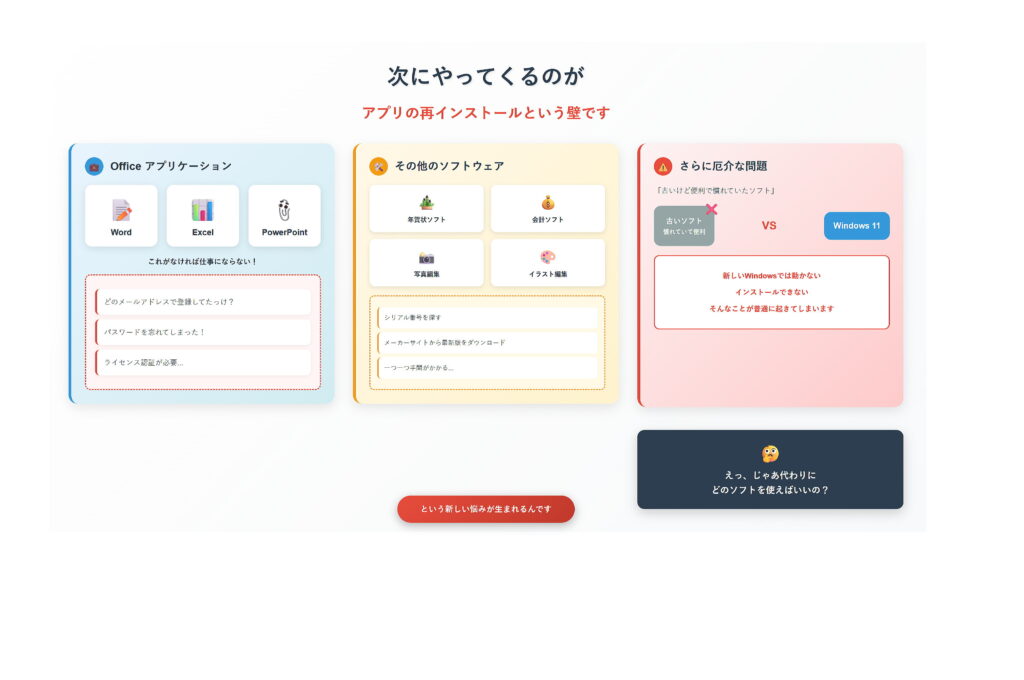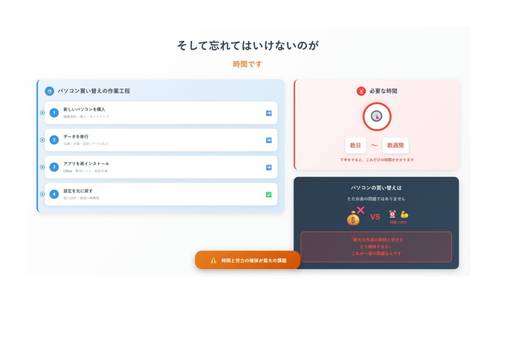 このように、パソコンの買い替えは「新しくすれば解決」ではなく、仕事や生活に直結する重大な問題を引き起こす可能性があります。