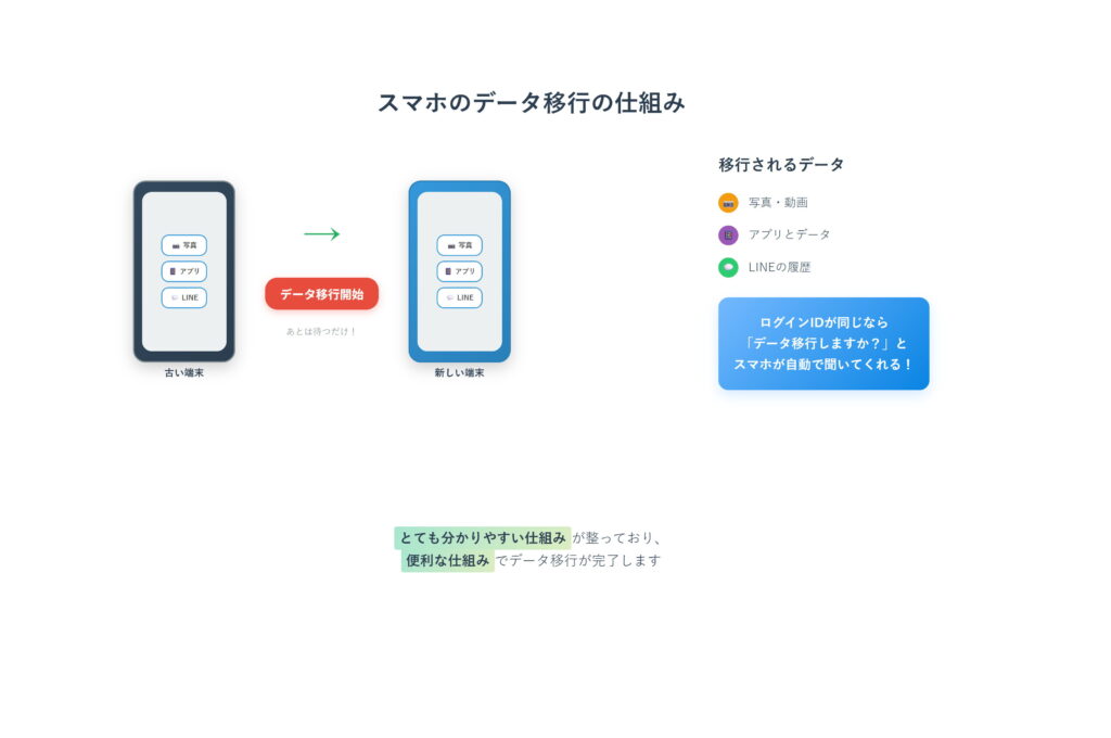 スマホは古い端末と新しい端末を並べ、「データ移行開始」を押せば写真やアプリ、LINE履歴まで一気に移してくれます。