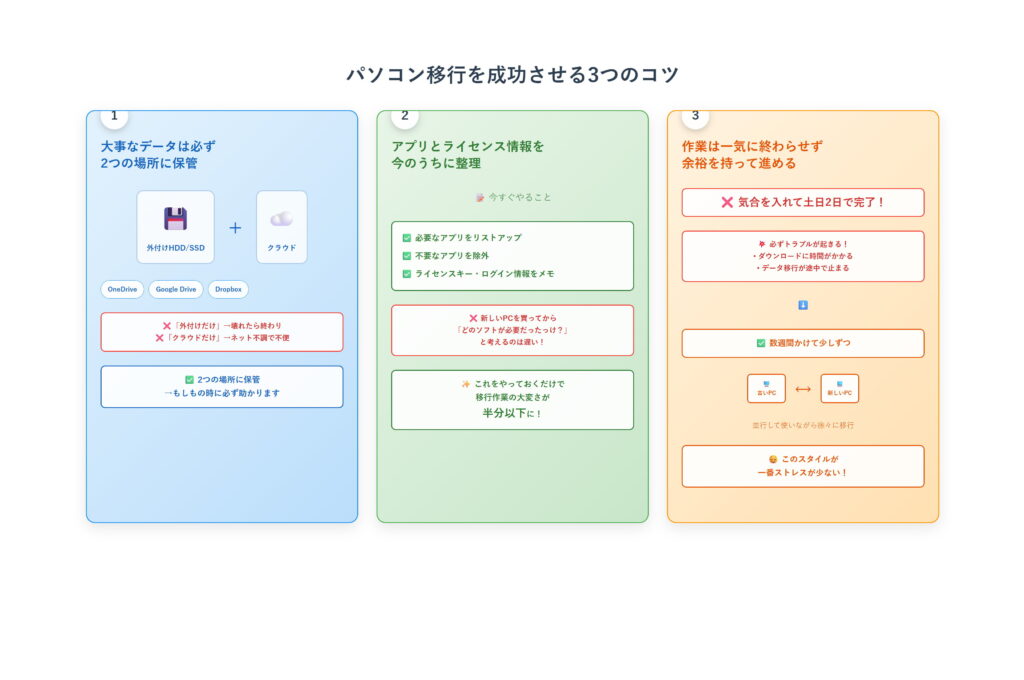 古いPCと新しいPCをしばらく並行して使いながら、少しずつ移していくのがおすすめです。