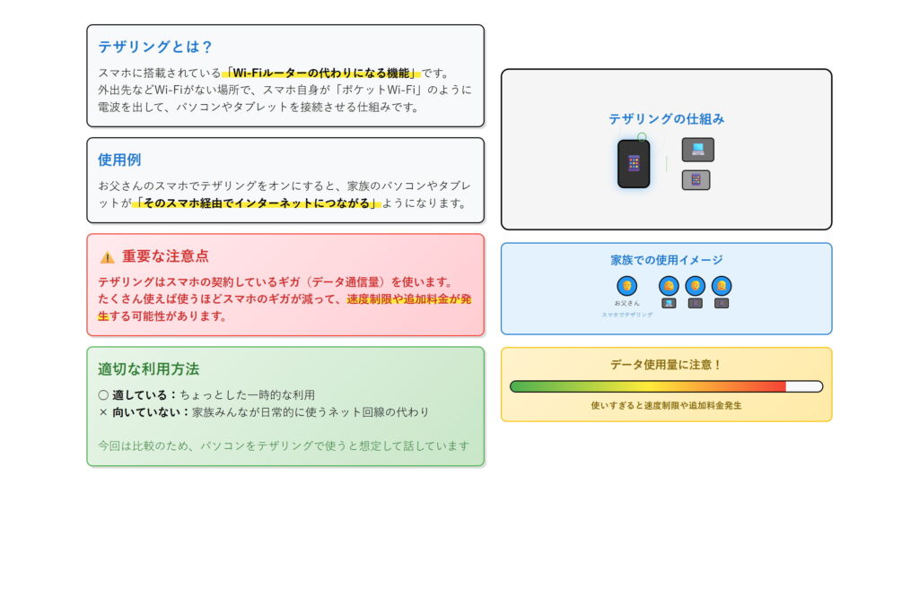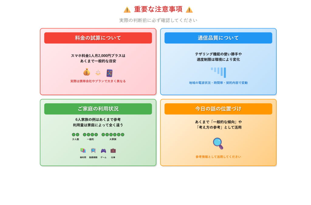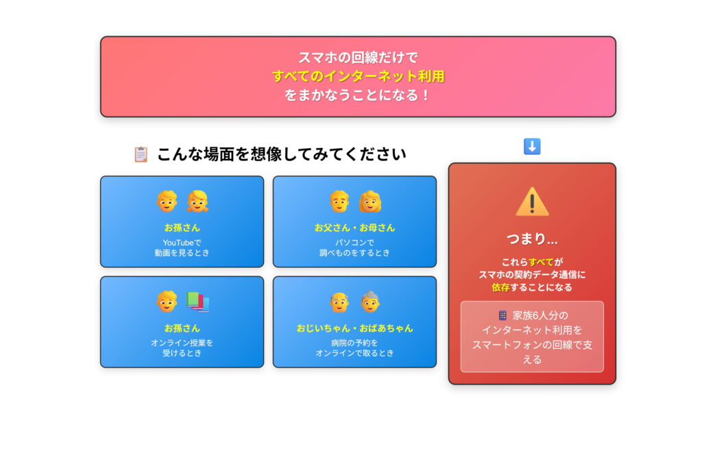つまり、テザリングは外出先や一時的な利用には便利ですが、家族6人分のネット利用を支えるには不向きだといえます。