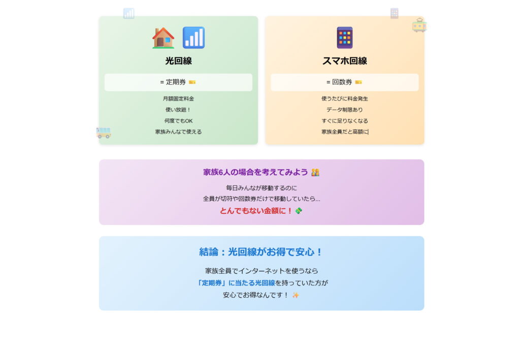 インターネットも同じで、家族全員が使うなら「定期券=光回線」が圧倒的に有利なのです。
