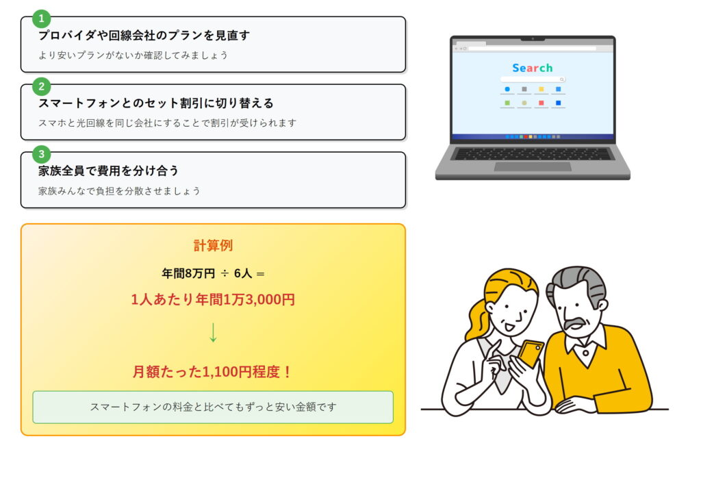 年間8万円を6人で割ると1人あたり月約1,100円。スマホ代に比べてもお得です。