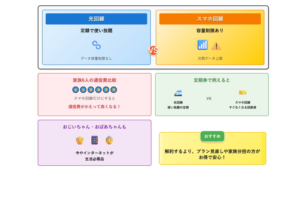 結論から言うと、光回線をやめると 家族全員のインターネット利用をスマホ回線だけでまかなう 必要が出てきます。
