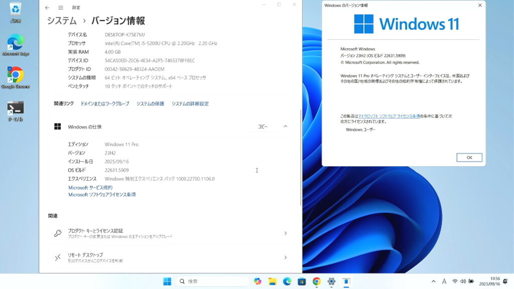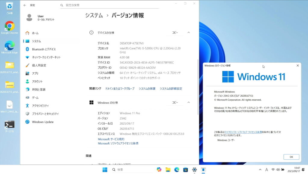 結果として、 23H2 → 24H2 → 25H2 という流れで、古いPCでもアップデートが可能であることが確認できました。