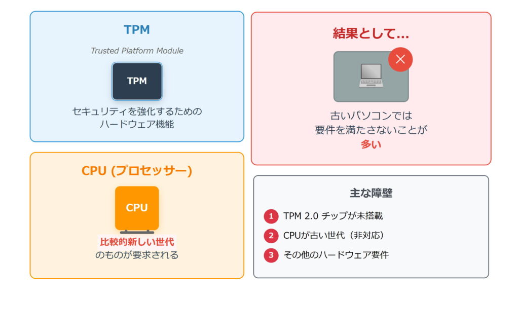 特に7年以上前のPCでは、これらの要件を満たさずにアップグレードできないことが多いです。