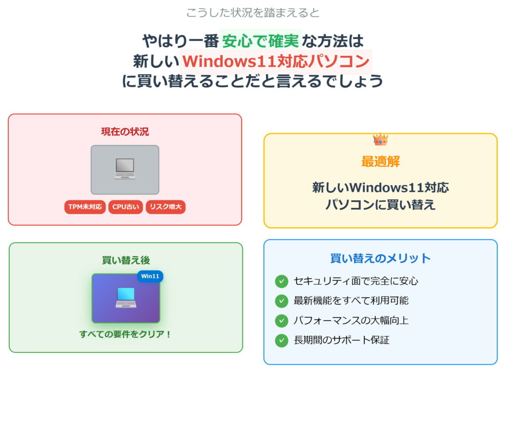 マイクロソフト公式も推奨しているのは、新しいWindows11対応PCへの買い替え です。