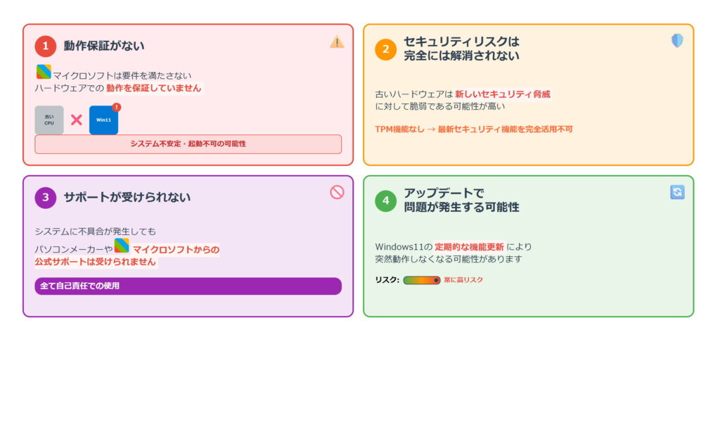 よって、この方法は「どうしても今のPCを延命したい人」向けの最終手段と考えるべきです。