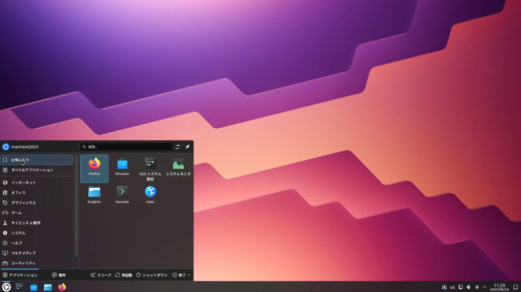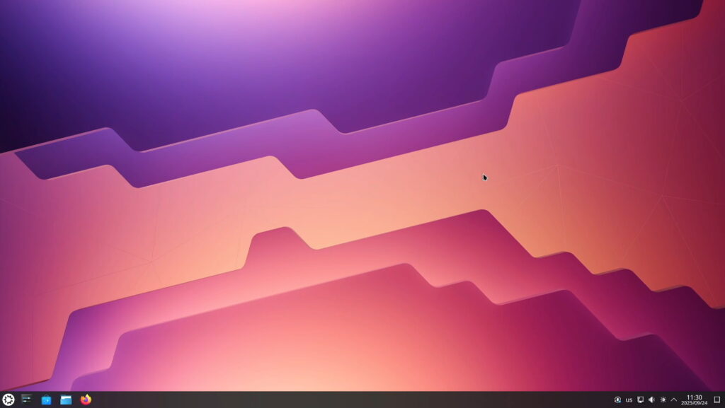 起動すると現れるのが、KDE Plasmaのデスクトップ。