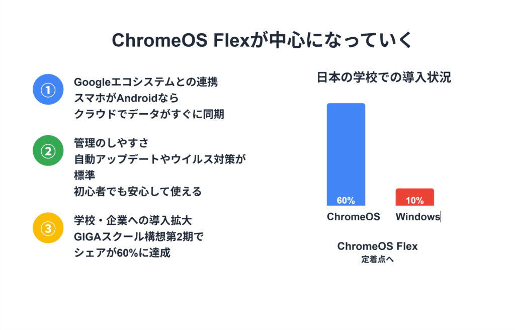 日本では「GIGAスクール構想 第2期」により、学校で使われる端末の約60%がChromeOS搭載機となっています。Windowsはわずか10%程度。