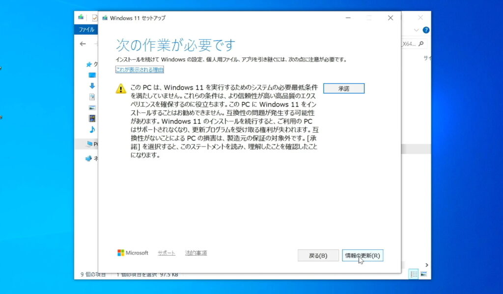 ライセンスに同意後、非対応の警告が表示されますが「承諾」をクリック。