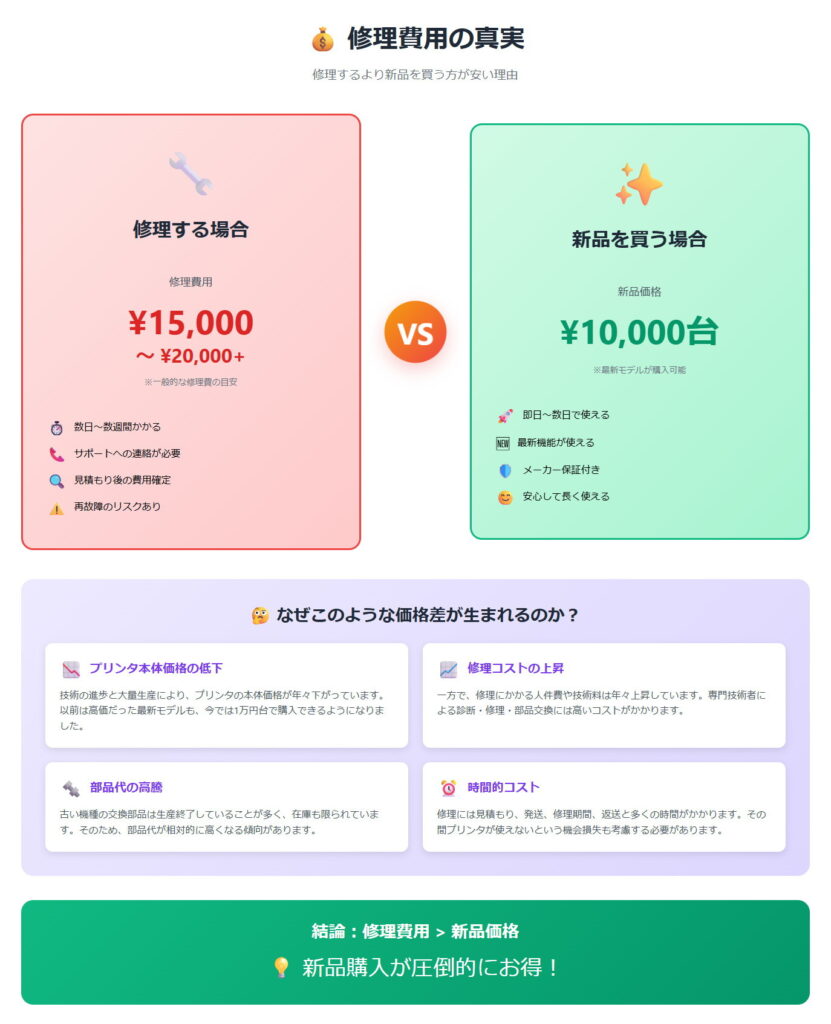 一般的なプリンタの修理費は 15,000円〜20,000円以上。