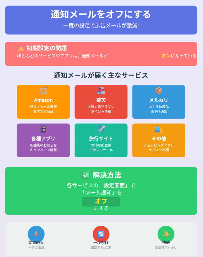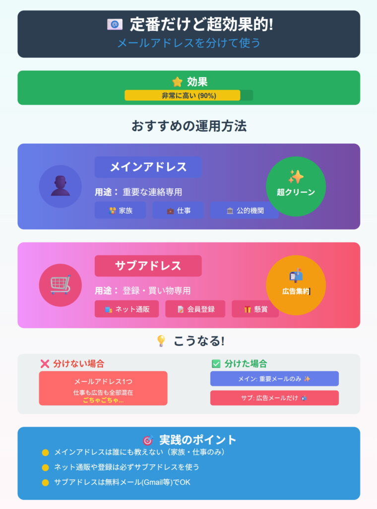私のところにも毎日数百通の広告メールが届きますが、実は適切な対策をすれば 迷惑メールの大半を根本から減らす ことができます。