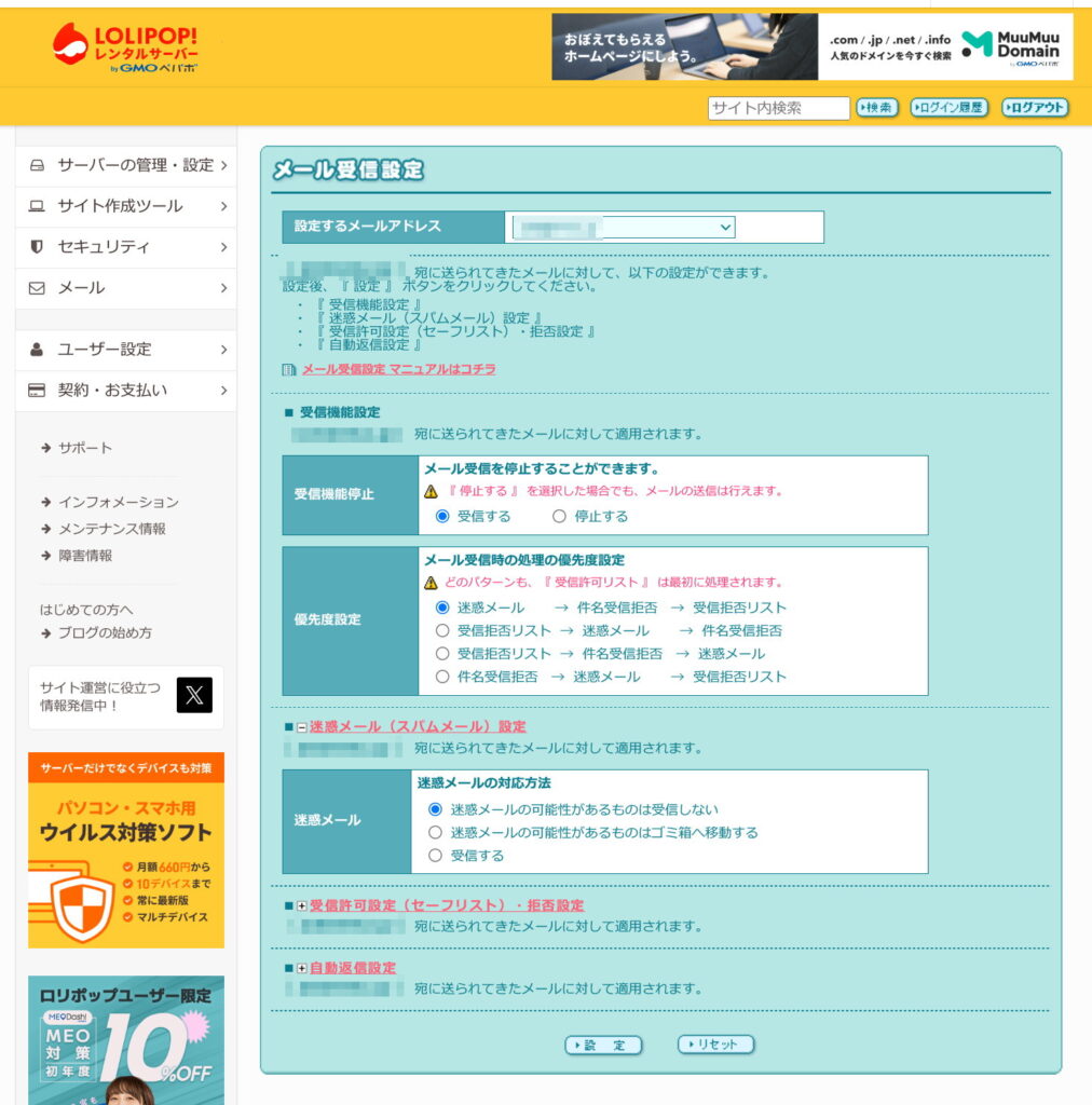 プロバイダ(ロリポップ・さくら・OCN・エックスサーバーなど)の管理画面から迷惑メールを 受信する前の段階でブロック できます。