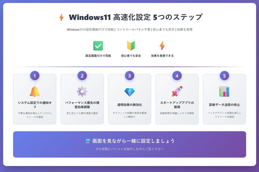 Windows標準機能の調整だけなので、初心者の方でも安全に実践可能です。