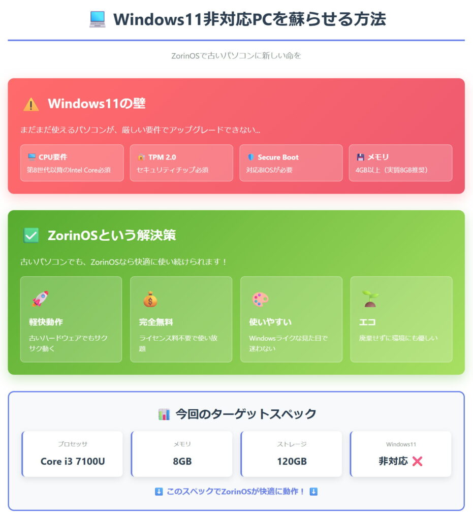 そこで今回は、Windows11の要件を満たしていないパソコンを、ZorinOSというLinuxディストリビューションで蘇らせる方法を、準備からインストール完了まで詳しく解説します。