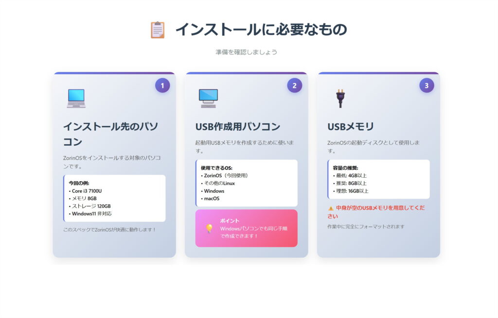 今回は、Windows11の要件を満たしていないCore i3 7100U搭載ノートパソコンに、ZorinOSをインストールする方法を詳しく解説しました。
