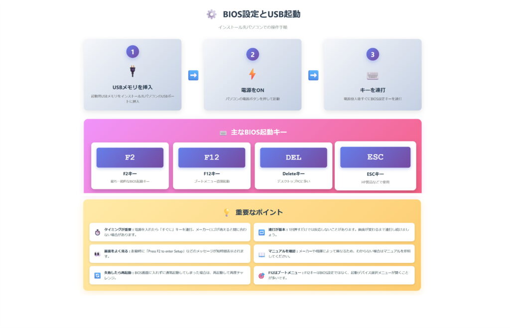 USBメモリを挿入し、電源を入れた直後にBIOSキー(F2、F12、DEL、ESCなど)を連打します。