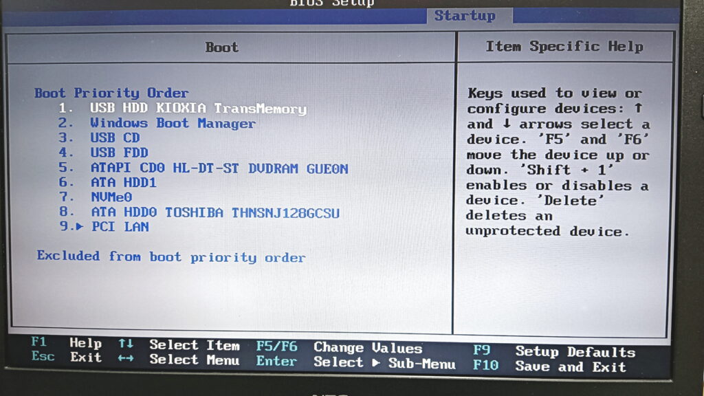 BIOSでは、起動順序(Boot Order)をUSBメモリ最優先に設定し、保存して終了します。
