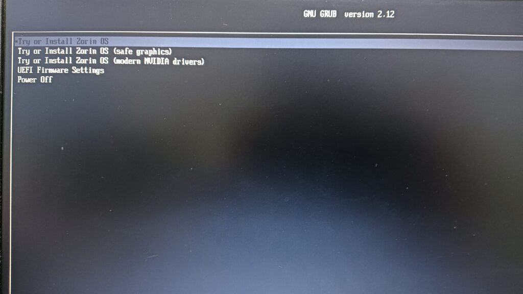 USBから起動すると、ZorinOSのブートメニューが表示されます。