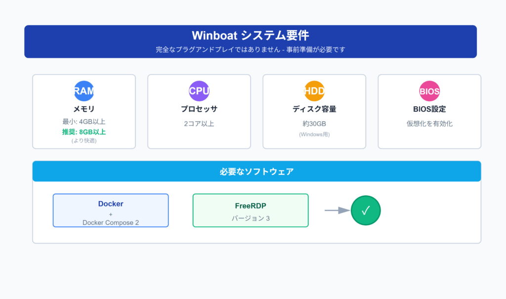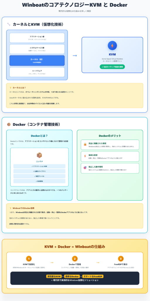 Winboatは KVM(Kernel-based Virtual Machine) を使用します。