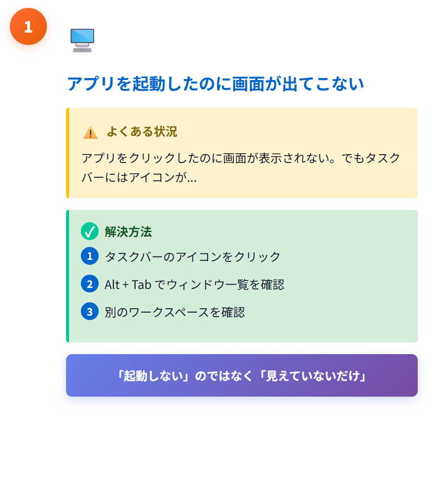 「起動しない」のではなく、 「見えていないだけ」という点を覚えておきましょう。