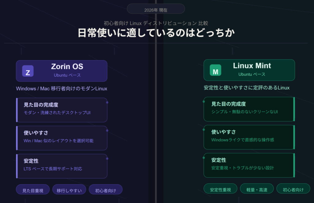 2026年現在、初心者向けLinuxとして特に人気なのがこの2つです。